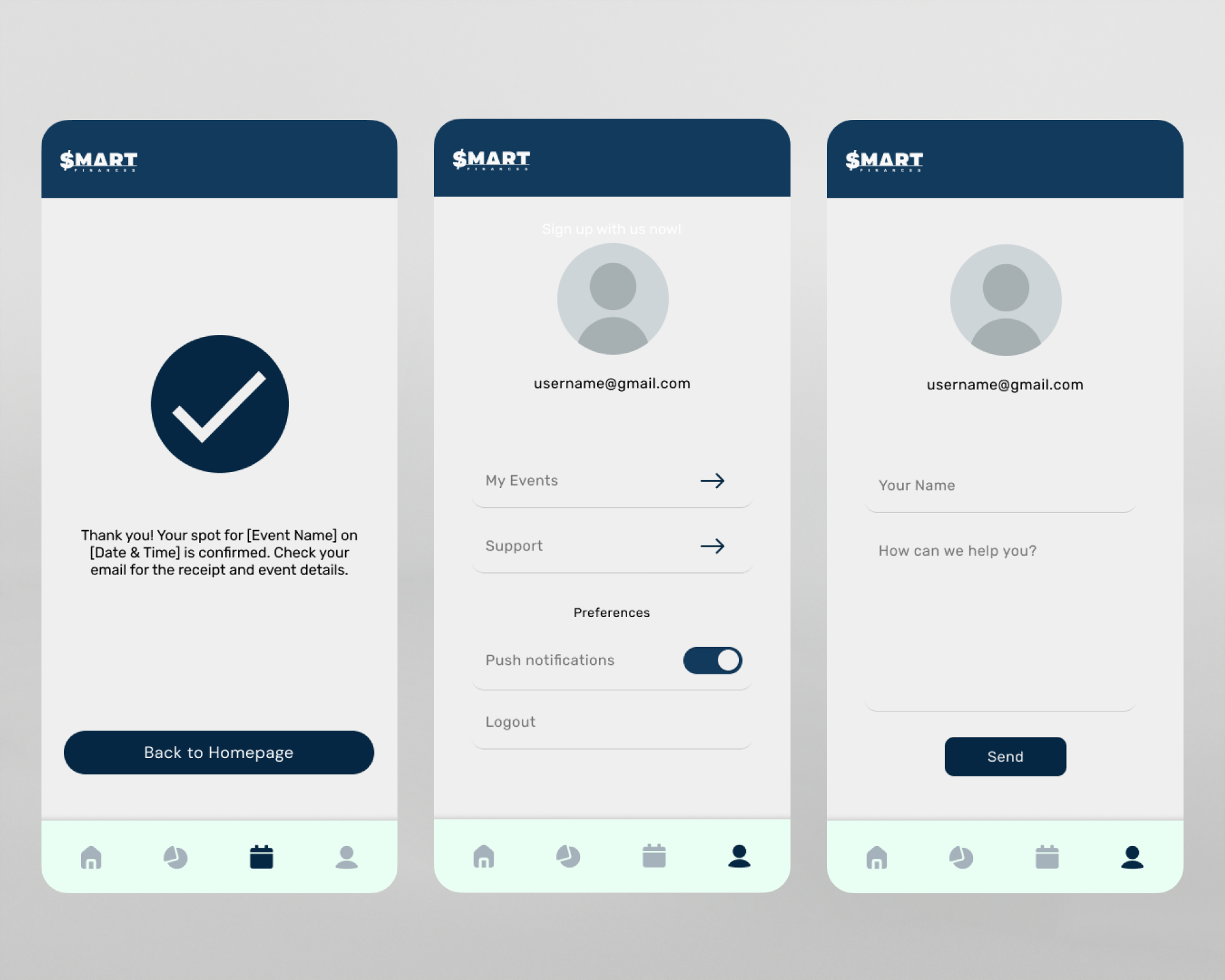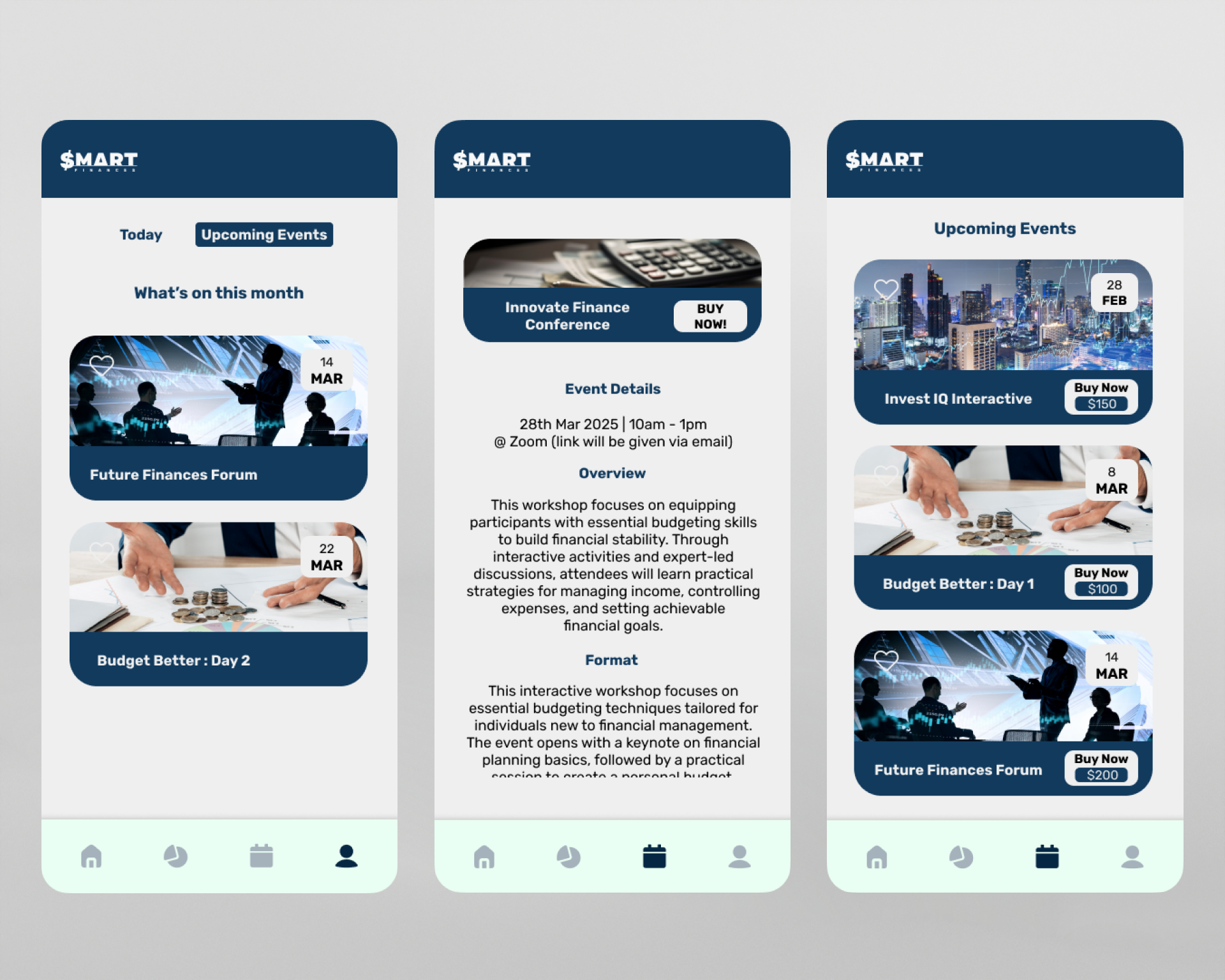 I also explored the concept of "event cards" — bite-sized content blocks that surface upcoming webinars, investment tips, and savings advice. These would be filterable by user interest and allow calendar integration for better engagement. Below are a few images of my early ideation including logo design, moodboard, low fidelity mock ups
