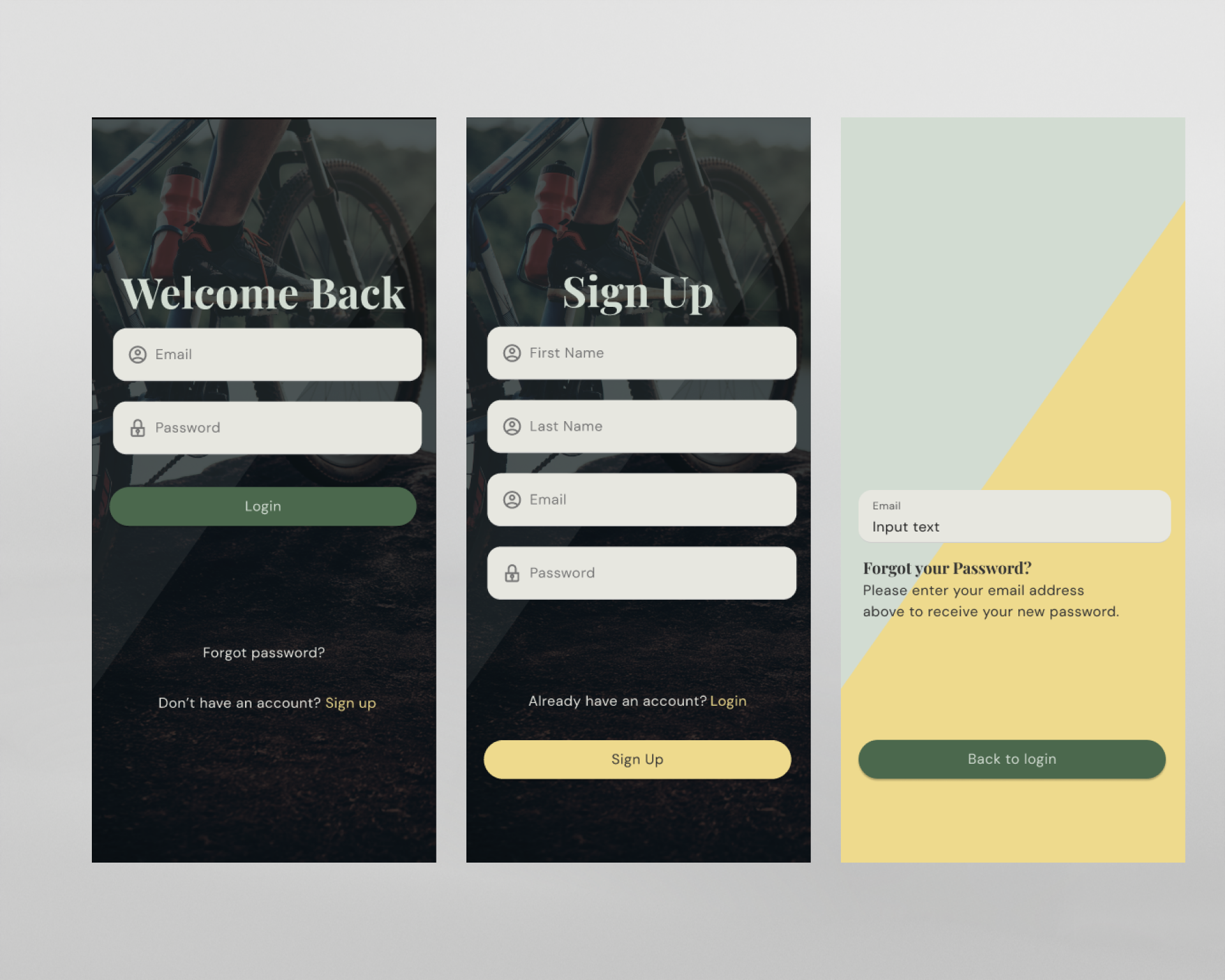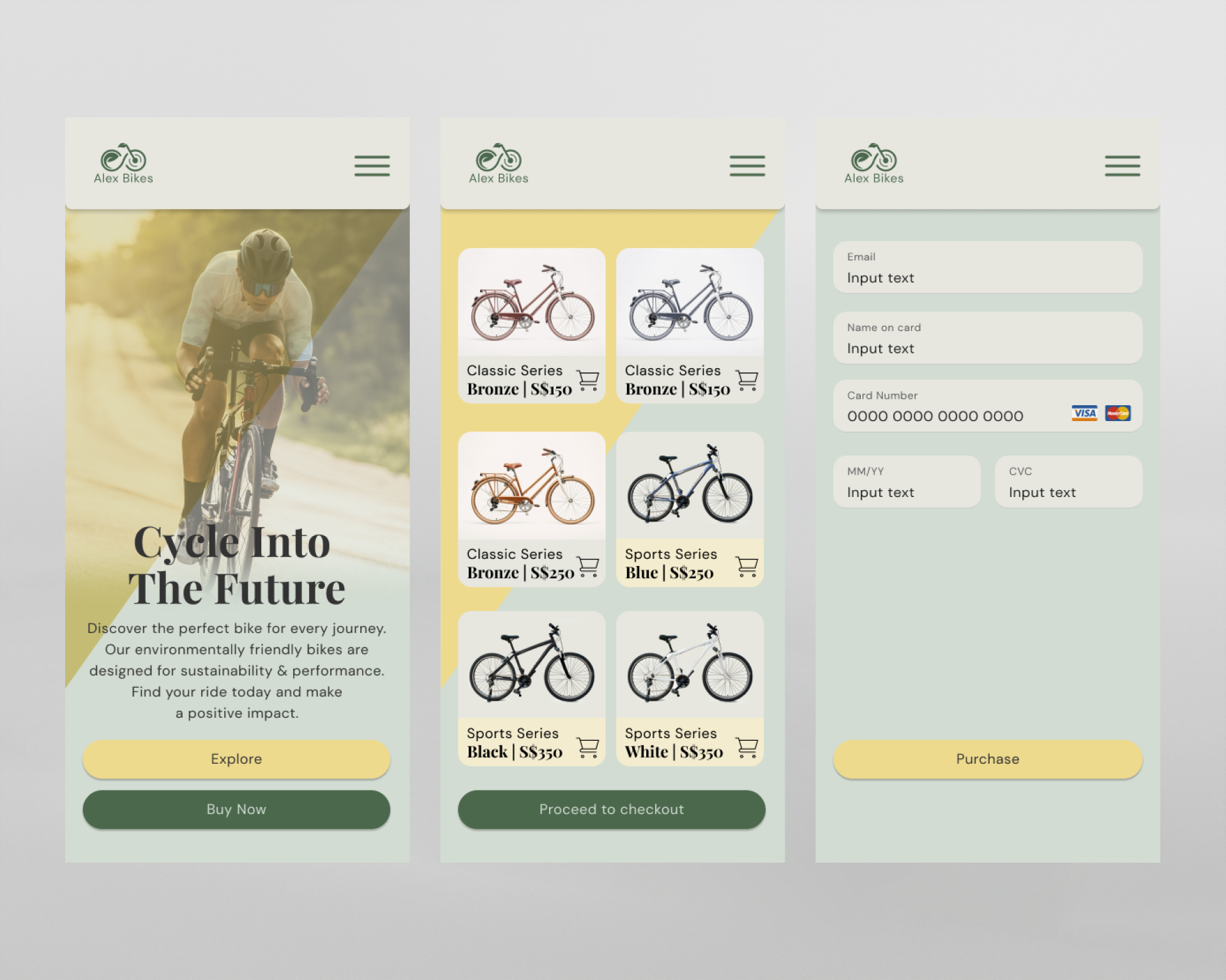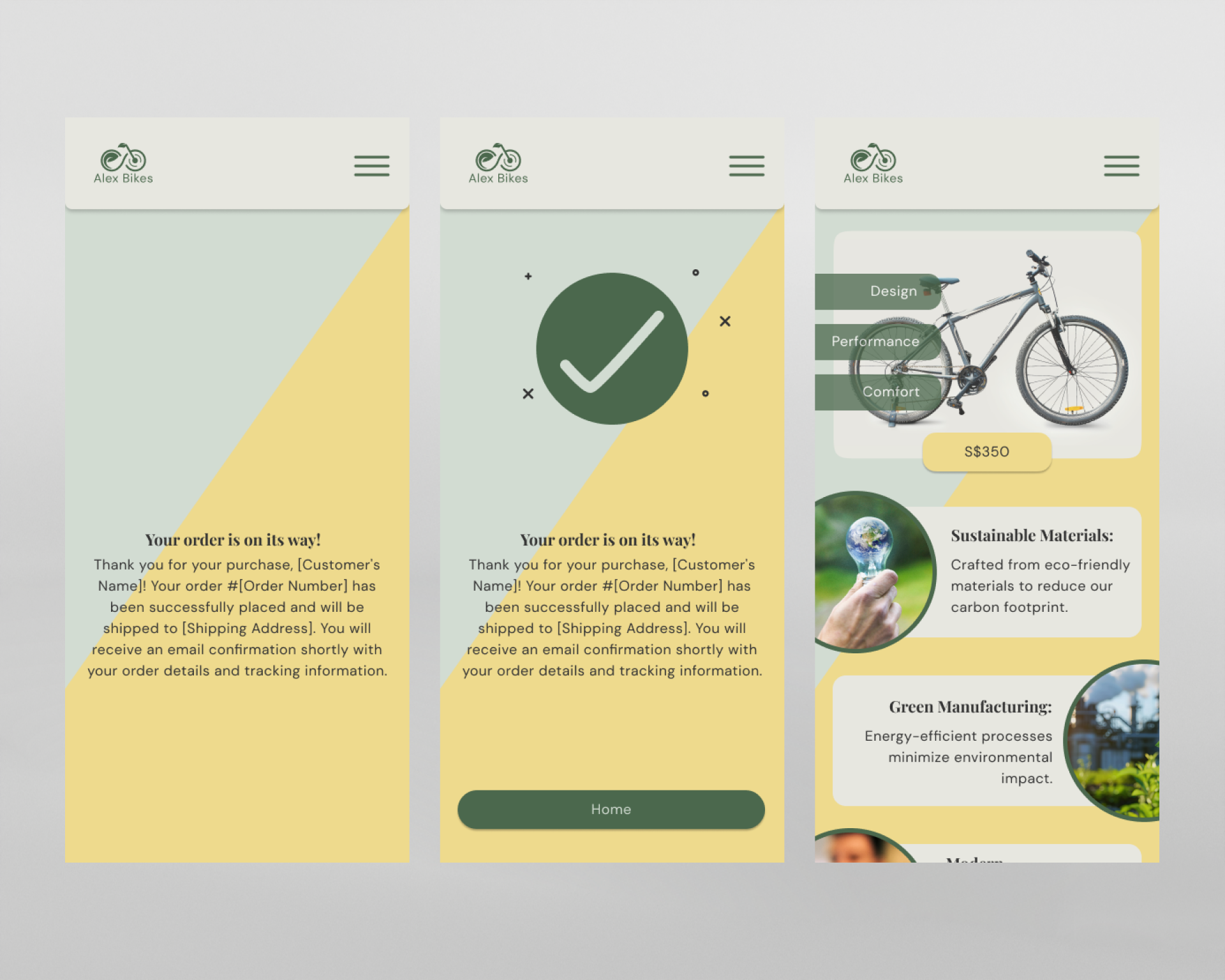 These are the final UI screens of Alex Bikes, designed to offer a seamless and visually appealing shopping experience. The interface balances clean, modern aesthetics with an eco-conscious feel, allowing users to explore bikes, learn about sustainable materials, and make purchases with ease. The layout and visuals were crafted to appeal to environmentally aware users who value both performance and planet-friendly products.