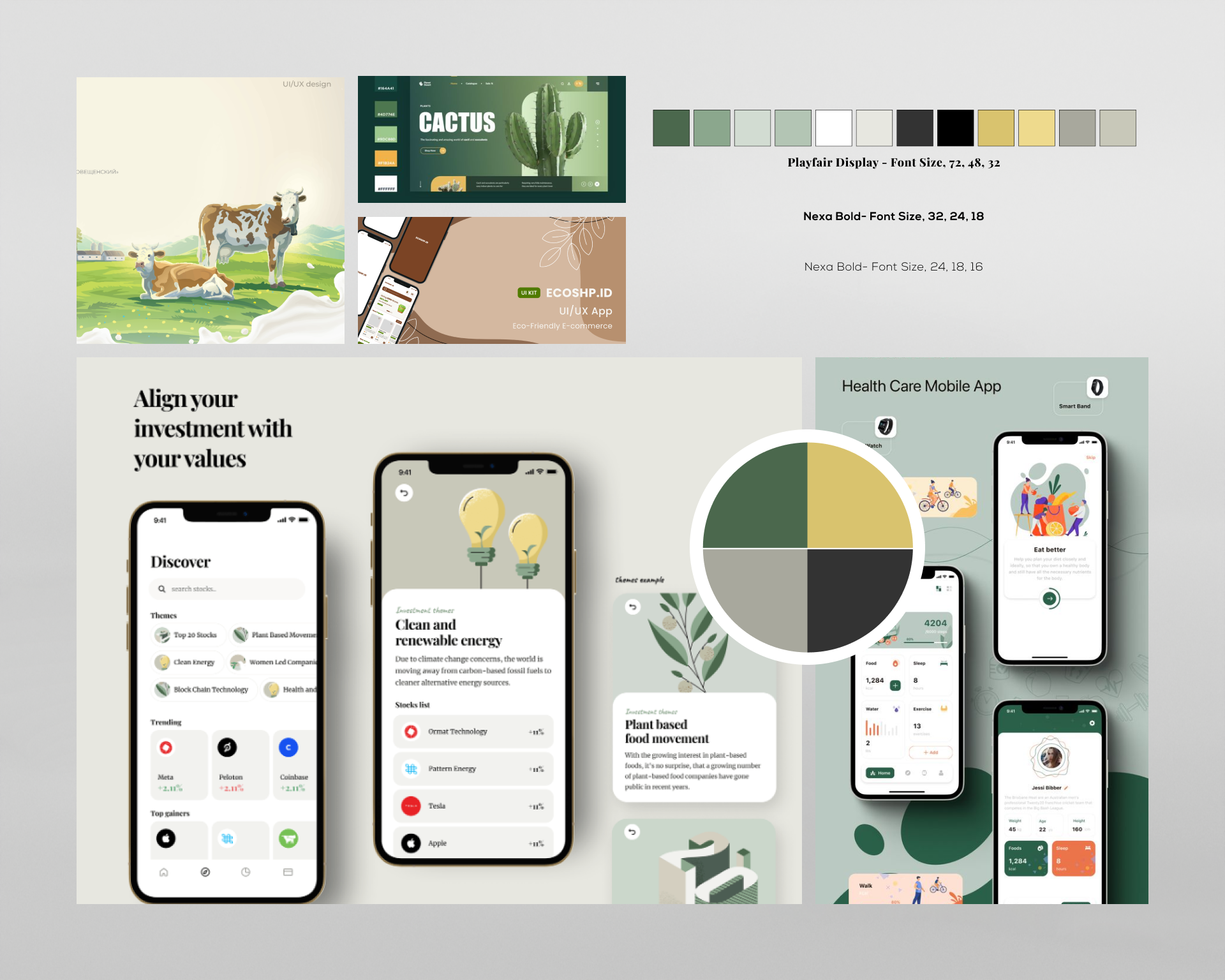 To support user flow, the app separates key areas like product exploration, sustainable materials, and checkout. Color-coding and button hierarchies were used to make sure key actions like “Buy Now” or “Explore” stood out while maintaining a calm, eco-conscious color palette. Below are a few images of my early ideation moodboard, low fidelity